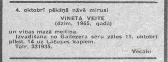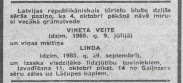 Republikāniskā tūristu kluba galvenā grāmatvede. LVU Juridiskās fakultātes studente. Apglabāta kopā ar 1 g.v. meitiņu Lindiņu.