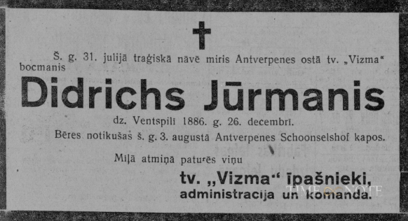 Latvijas tvaikoņa «Vizma» kapteinis ziņo, ka Antverpenes ostā noticis traģisks nelaimes gadījums ar kuģa bocmani Didriķi Jūrmani. Viņam, atgriežoties vakarā no pilsētas uz ostu, nenoskaidrotu iemeslu dēļ, uzbrauca virsū manevrējošā lokomotīve. D. Jūrmanis nesamaņas stāvoklī nogādāts ātrās palīdzības automobilī slimnīcā, kur noskaidrojās, ka viņam lauzts gurna kauls un nodarīti citi nopietni iekšējo orgānu bojājumi. Pēc divām dienām D.Jūrmanis miris. Nelaiķi, kas ir ventspilnieks, pirms dažām dienām apglabāja Antverpenes luterāņu kapos.