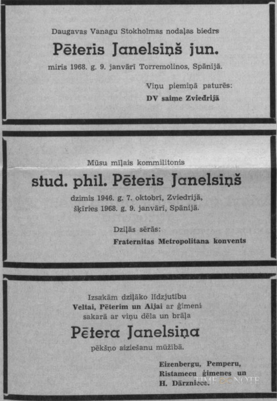 Stokholmā Pētera Janelsiņa sen. un Pētera Janelsiņa jun. urnu apglabāšana ģimenes kapā ar piemiņas brīdi Cerību kapellā (Hoppets kapell) dienvidu Stokholmas Meža kapos (Skogskyrkogārden) notiks piektdien, 1992.gada 11 .decembrī.