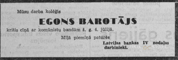 Pagājušā gada 4.jūlijs prasīja daudzu tādu latviešu dzīvības, kas nebaidījās savu latvietību apliecināt ar ieroci rokā. Olaines purvos šajā dienā savas galvas nolika: Egons Barotājs — jauneklis, kam visa dzīve vēl bija priekšā, students, sportists, sava tēva — flotes virsnieka — vienīgais dēls;