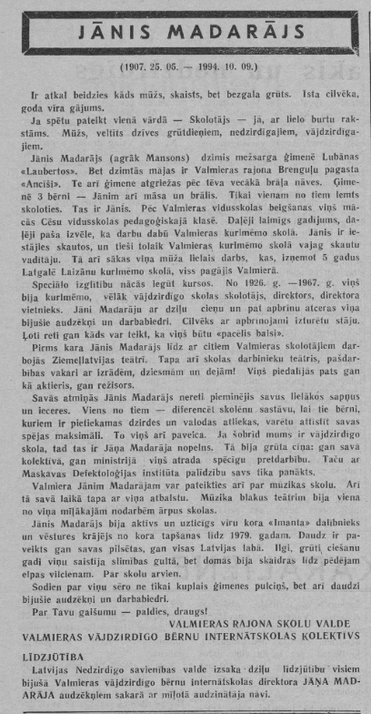 Ir atkal beidzies kads mūžs, skaists, bet bezgala grūts, īsta cilvēka, goda vīra gājums. Ja spētu pateikt vienā vārdā — Skolotājs — jā, ar lielo burtu rakstāms. Mūžs, veltīts dzīves grūtdieņiem, nedzirdīgajiem, vājdzirdīgajiem. Jānis Madarājs (agrāk Mansons) dzimis mežsarga ģimenē Lubānas «Laubertos». Bet dzimtās mājas ir Valmieras rajona Brenguļu pagasta «Ancīši». Te arī ģimene atgriežas pēc tēva vecākā brāļa nāves. Ģimenē 3 bērni — Jānim ir arī māsa un brālis. Tikai vienam no tiem lemts skoloties. Tas ir Jānis. Pēc Valmieras vidusskolas beigšanas viņš mācās Cēsu vidusskolas pedagoģiskajā klasē. Daļēji laimīgs gadījums, daļēji paša izvēle, ka darbu dabū Valmieras kurlmēmo skolā. Jānis ir iestājies skautos, un tieši tolaik kurlmēmo skolā vajag skautu vadītāju. Tā arī sākas viņa mūža lielais darbs, kas, izņemot 5 gadus Latgalē Laizānu kurlmēmo skolā, viss pagājis Valmierā. Speciālo izglītību nācās iegūt kursos. No 1926. g. — 1967. g. viņš bija kurlmēmo, vēlāk vājdzirdīgo skolas skolotājs, direktors, direktora vietnieks. Jāni Madarāju ar dziļu cieņu un pat apbrīnu atceras viņa bijušie audzēkņi, un darbabiedri. Cilvēks ar apbrīnojami izturētu stāju. Ļoti reti gan kāds var teikt, ka viņš būtu «pacēlis balsi». Pirms kara Jānis Madarājs līdz ar citiem Valmieras skolotājiem darbojās Ziemeļlatvijas teātrī. Tapa arī skolas darbinieku teātris, pašdarbības vakari ar izrādēm, dziesmām un dejām! Viņš piedalījās pats gan kā aktieris, gan režisors. Savās atmiņās Jānis Madarājs nereti pieminējis savus lielākos sapņus un ieceres. Viens no tiem — diferencēt skolēnu sastāvu, lai tie bērni, kuriem ir pietiekamas dzirdes un valodas atliekas, varētu attīstīt savas spējas maksimāli. To viņš ari paveica. Ja šobrīd mums ir vājdzirdīgo skola, tad tas ir Jāņa Madarāja nopelns. Tā bija grūta cīņa: gan savā kolektīvā, gan ministrijā viņš atrada spēcīgu pretdarbību. Taču ar Maskavas Defektoloģijas institūta palīdzību savs tika panākts. Valmiera Jānim Madarājam var pateikties arī par mūzikas skolu. Arī tā savā laikā tapa ar viņa atbalstu. Mūzika blakus teātrim bija viena no viņa mīļākajām nodarbēm ārpus skolas. Jānis Madarājs bija aktīvs un uzticīgs vīru kora «Imanta» dalībnieks un vēstures krājējs no kora tapšanas līdz 1979. gadam. Daudz ir paveikts gan savas pilsētas, gan visas Latvijas labā. Ilgi, grūti, ciešanu gadi viņu saistīja slimības gultā, bet domas bija skaidras līdz pēdējam elpas vilcienam. Par skolu arvien. Šodien par viņu sēro ne tikai kuplais ģimenes pulciņš, bet arī daudzi bijušie audzēkņi un darbabiedri. Par Tavu gaišumu — paldies, draugs! (Kopsolī, 01.10.1994)