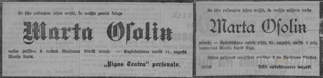 Latviešu gleznotājs Voldemārs Zeltiņš, uzzinājis, ka noindējusies aktrise Marta Ozoliņa, kurā mākslinieks bija nelaimīgi iemīlējies un kuras portretu grasījās gleznot, 1909. gada 13. septembrī arī viņš izdarīja pašnāvību, iedzerot lielu devu bromkālija.
