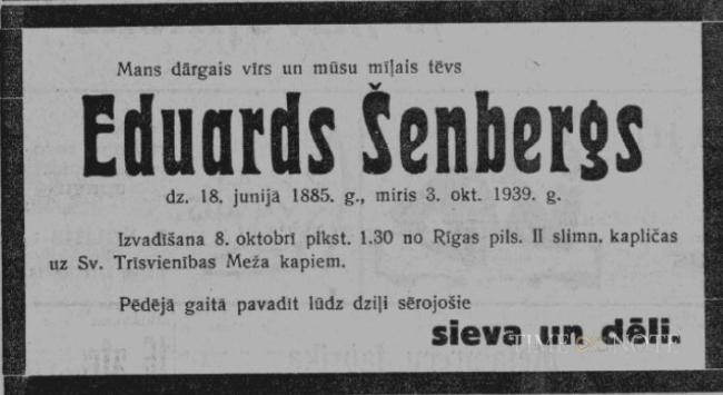 Pēc neilgas slimošanas 3. oktobrī Rīgas pilsētas 2. slimnīcā aizsaulē aizgāja dzelzceļu policijas Rīgas iec. 1. šķ. uzraugs Eduards Šēnbergs. Atrodoties no 25. augusta slimības atvaļinājumā, viņa veselības stāvoklis pasliktinājās, bija jādodas uz slimnīcu, kur ārsti konstatēja ļaundabīgu audzēju krūtīs, kas drīz vien piespieda izbeigt dzīves gaitas. Nelaiķis piedzimis 1885. g. 18. jūnijā, Rīgas apr. Krimuldas pagastā. 1900. g. beidzis Paltmanes draudzes skolu. Līdz 1919. g. darbojies kā meistars Rīgas gurnijrūpniecībā «Provodņiks». 1919. g. novembrī iesaukts armijā un dienējis ložmetēju komandā kara skolā līdz 1920. g. martam. Tā paša gada 1. decembrī iestājies dzelzceļu policijas dienestā par Rīgas iecirkņa 2. šķ. uzraugu, ar 1922. g. 1. maiju paaugstināts par 1. šķ. uzragu un dienējis nepārtraukti. Par nopelniem apbalvots ar Viestura ordeņa 5. šķiru. Šēnbergu apglabāja svētdien 8. oktobrī Sarkandaugavas kapos, piedaloties darba biedriem un dzelzceļnieku biedrības pārstāvjiem ar karogu un orķestri. Dzelzceļpolicijas darbinieku vārdā atvadījās Rīgas iec. pr-ks K. Vintens un nolika vaiņagu. Dzelzceļnieku b-bas pārstāvis pie svaigās kapa kopas novietoja piemiņas plāksni.