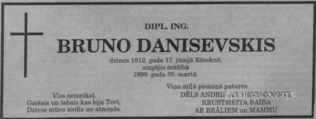 Bruno Daniševskis (12.06.1912 Rēzeknē-30.03.1999 ASV, La Crosse, Wisconsin). Calumet Park Cemetery, Merrillville, Lake County, Indiana, USA. Dēls Andris, vedekla Connie, krustmeita Baiba.