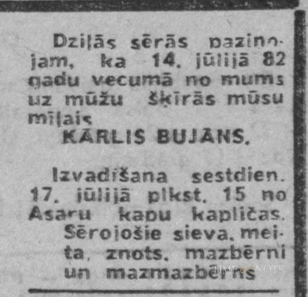 K. Bujāns bija Zemgales galvenais agronoms. 1941.gadā izbēga no izsūtīšanas, jo naktī neatradās mājās - ratos braukāja pa ceļiem, bet 1949.gadā slēpās mežā.