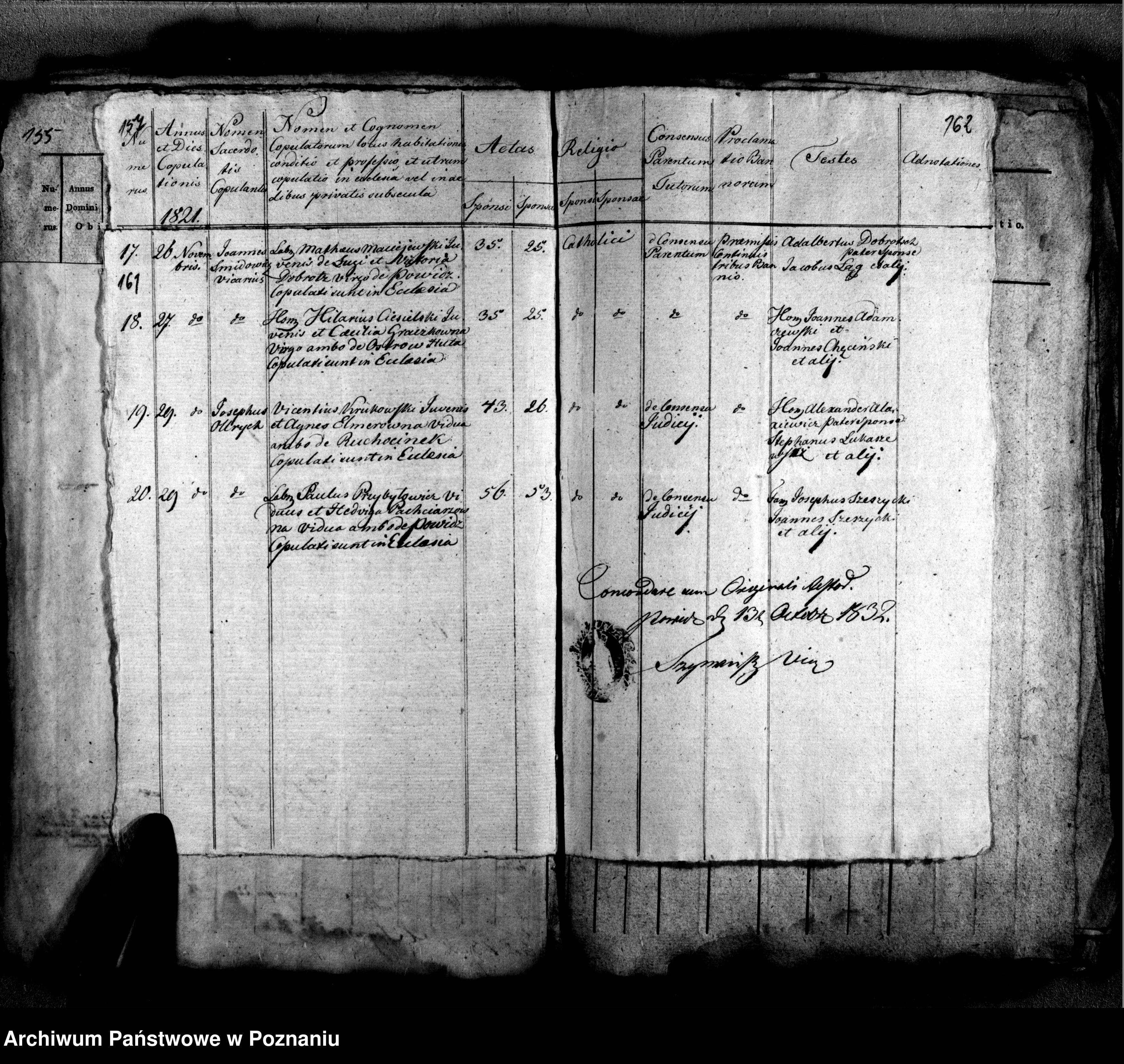Małżeństwo : Hilary Ciesielski (35 l.) i Cecylia Graczkówna (?25 l.) , oboje z Ostrowa Huty , ślub dn. 27.11.1821 r. (Akt 18) , Parafia Powidz .