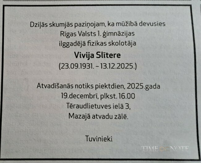 Sēru vēsts. Mūžībā aizgājusi visu laiku izcilākā skolotāja Vivija Slītere. Atvadīšanās no skolotājas piektdien, 19. decembrī, plkst. 16:00, Tēraudlietuves ielā 3, “Atvadu” mazajā zālē. Juris Močuļskis, jr.