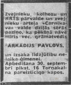 Septembra beigās Rīgā pēkšņā nāvē miris viens no vecākās paaudzes latviešu futbolistiem - Arkādijs Pavlovs. Divdesmitajos gados Pavlovs bija Latvijas valsts izlases vienības dalībnieks, piedaloties izlasē arī 1924. gada Parīzes olimpiādē. Vecākās paaudzes futbola sporta draugi atceras Pavlovu kā vienu no labākiem tā laika kreisajiem malējiem uzbrucējiem. Viņš iedalīts 25 reizes valsts izlases sastāvā. (Londonas avīze, 04.11.1960)