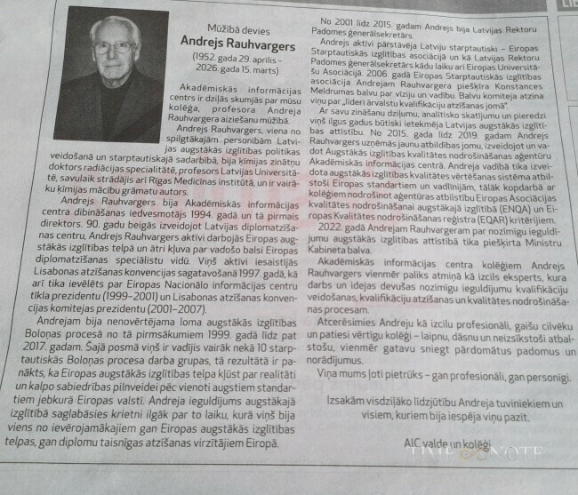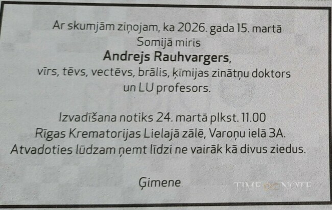 15. martā mūžībā devies bijušais Latvijas Medicīnas akadēmijas (tagad − Rīgas Stradiņa universitāte) Ķīmijas katedras vadītājs doc. Andrejs Rauhvargers.