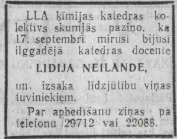 1979. gadā L. Neilande aizgāja pensijā. (Plēsums, 29.09.1983)