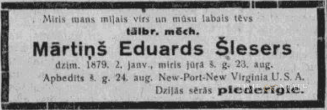 Tālbraucējs mehāniķis. Miris jūrā ASV. Apbedīts New Port, New Virginia.