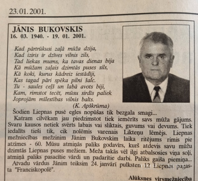 Jānis Bukovskis was born 16.03.1940. businesman, he was active in social activities and participated in different activities in the territory of Latvia until 1996.