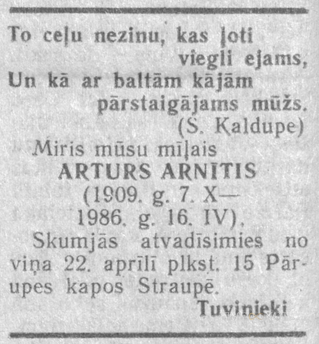 1945.14.10 no Zviedrijas nelegāli atgriezies kopā ar E.Andersonu, L.Pētersonu un J.Šmitu.
