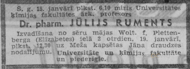 Jūlijs Ruments dzimis 1900. gada 14. decembrī Rūjienā. No 1918. līdz 1920. gadam piedalījies Latvijas atbrīvošanas cīņās pret boļševikiem. 1922. gdā iestājies Latvijas universitātes ķīmijas fakultātes farmācijas nodaļā, kuru ļoti sekmīgi beidzis 1927. gada maijā, iegūdams farmācijas kandidāta grādu. Studiju laikā viņam piešķirta pirmā godalga par sacensības darbu — «Mikroorganismu ietekme uz vilkogu lapu izvilkumu». Pēc Universitātes beigšanas darbojās mūsu
