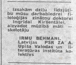 Irma Behmane bija Rīgas 3. vidusskolas vēstures skolotāja, mācību daļas vadītāja.