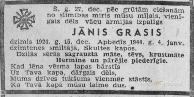 2. Pasaules kara dalībnieks, Latviešu leģiona leģionārs, armijas izpalīgs. Miris no smagas slimības.
