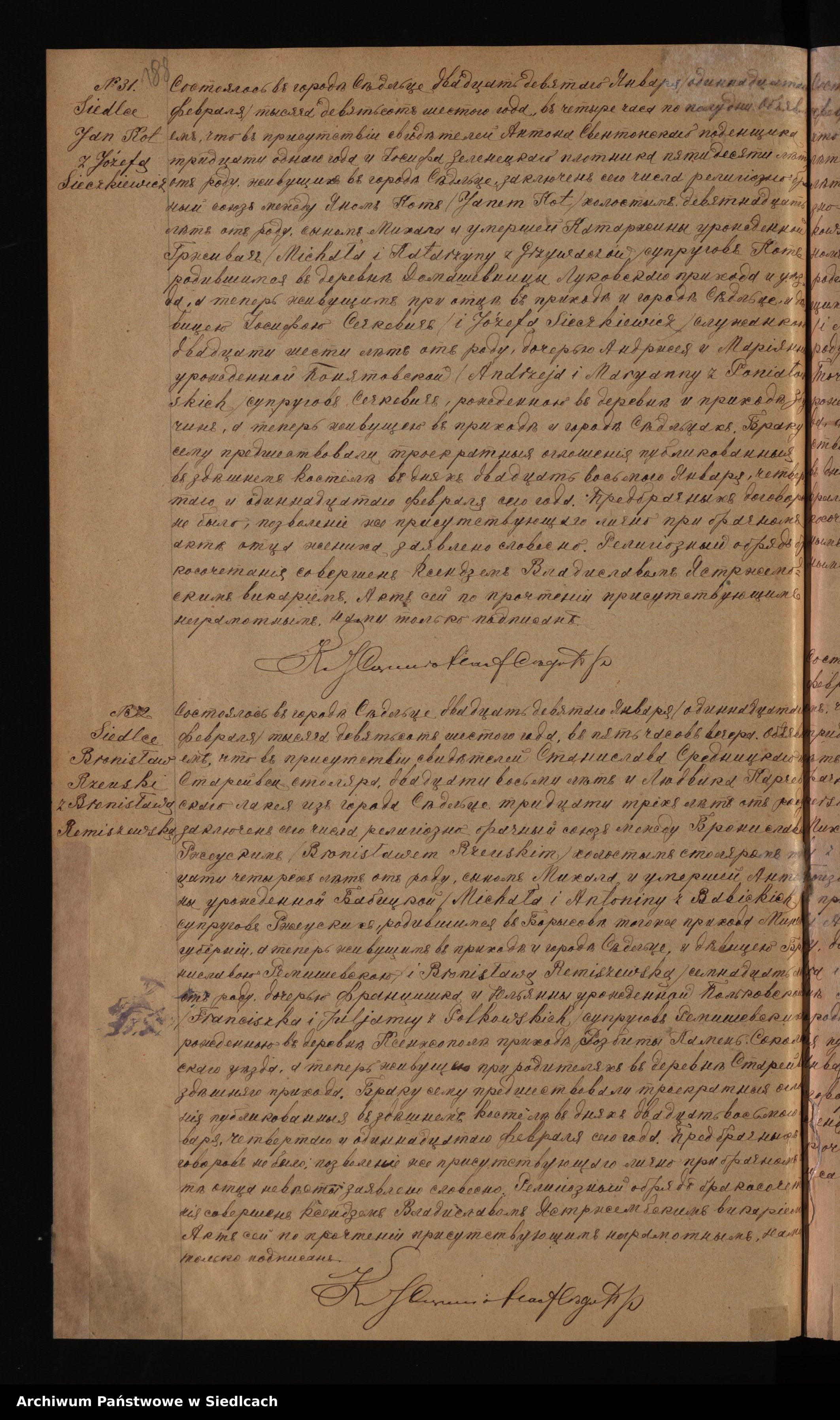 Małżeństwo : Bronisława Rzewuska z d. Remiszewska i Bronisław Rzewuski , zawarto w 1906 r. dn. 11 lutego , w kościele rzymskokatolickim , w parafii pw. św. Stanisława Biskupa i Męczennika , w Siedlcach . (Akt 32)
