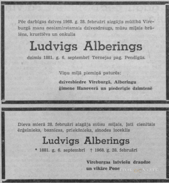 Luža Alberinga šīs zemes atliekas 1. martā no Vircburgas Mocarta kapsētas pēdējā ceļā, prāvam pavadītāju pulkam piedaloties, izvadīja prāv. E.Rozītis un māc. E. Bērziņš. Ludis Alberings darbīgs, sirsnīgs un taisns būdams, visu savu garo mūžu kalpoja latviešu sabiedrībai un savam tuvcilvēkam, tā atstādams lielu, labu un skaistu piemiņu, ko ļaudis vēl ilgi daudzinās. Alberings trimdā bija apzinājis vai visus rūjieniešus. Viņš saņēma ziņas no Latvijas par Rūjienu un apkārtni un turienes cilvēkiem. Viņš visas ziņas bija sācis kārtot, jo gribēja uzrakstīt grāmatu par Rūjienu un apkārtni, kas savā ziņā būtu Rūjienas un apkārtnes vēsture. (Latvija, 16.03.1968)