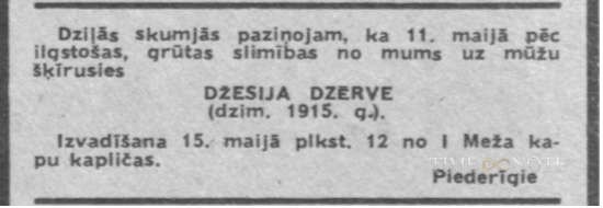 Izpildot Džesijas Dzērves vēlēšanos, atvadīšanās no viņas Meža kapu kapličā notika, skanot nevis bēru mūzikai, bet melodijām no viņas miļās filmas. Mēs stāvējām pie viņas kapa ar trīcošām sirdīm; Džesijas mūžs labāk par jebkuru ekrāna vīziju pierādīja, ka, pastāvot pret ļaunumu, labās jūtas nebūt nebija tik bezspēcīgas, kā dažkārt šķiet. (Diena, 20.06.1992, no Zigmunda Skujiņa raksta)