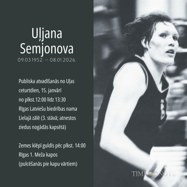 74. dzīves gadā mūža miegā aizmigusi leģendārā basketboliste – divkārtējā olimpiskā, trīskārtējā pasaules un desmitkārtējā Eiropas čempione, vienpadsmitkārtējā Eiropas čempionvienību kausa ieguvēja, FIBA, pasaules basketbola un pasaules sievišu basketbola Slavas zāļu dalībniece Uļjana Semjonova (1952. gada 9. marts – 2026. gada 8. janvāris).