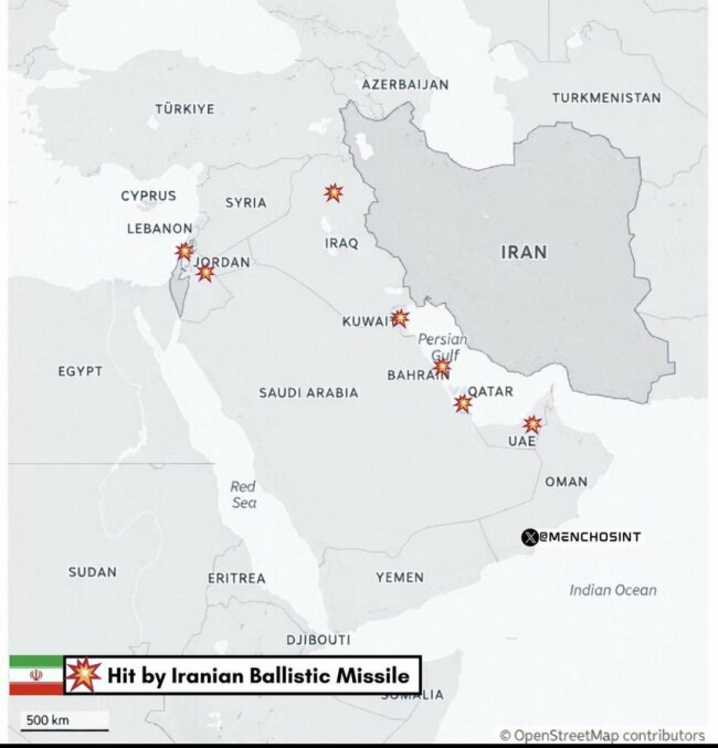 • Uzbrukumi: Irāna šodien palaida vairākas kārtas ballistisko raķešu uz AAE. UAE gaisa aizsardzība (kopā ar ASV sistēmām) pārtvēra lielāko daļu, bet daži fragmenti krita.
