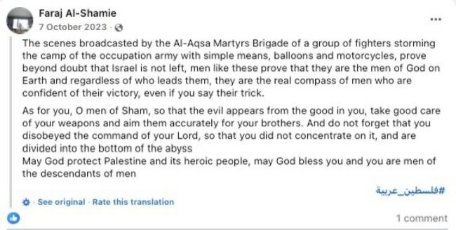 Džihāda Al Šamija tēvs, ķirurgs Farajs Al Šamijs, publicējis virkni ierakstu Facebook, atbalstot nāvējošos 2023. gada uzbrukumus ebreju valstij, atklāja Telegraph, tostarp vienu, kurā viņš zvērības raksturoja kā "brīnumu pēc visiem standartiem" un nosaucis Hamas slepkavas par "Dieva vīriem virs zemes".