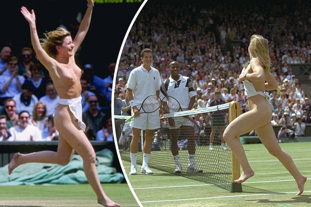 Pirms fināla mača sākuma, kurā bija jāspēlē Ričardam Krajičekam un MaliVaiam Vašingtonam Centrālā Korta laukumā, kad spēlētāji jau bija kortā un pozēja fotogrāfiem, pie tīkla izskrēja strīkere, kurai bija tikai neliels priekšauts, un parāva augšā, pilnīgi atkailinoties. Publika uztvēra iznācienu ar aplausiem un smaidu. Meitene vēl paspēja aizskriet līdz Karaliskajai ložai, bet tad apsardze jau bija bija pārvarējusi pirmo pārsteiguma mulsumu un meiteni izveda no kortiem.