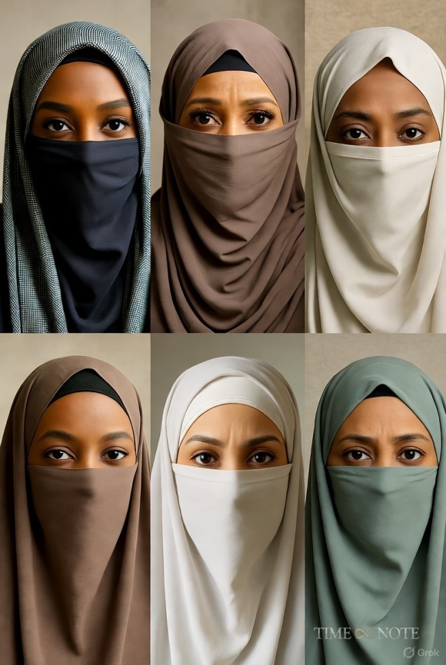 - Hidžābs: Lakats uz galvas, kas sedz matus, kaklu un krūtis, bet seja paliek atklāta.