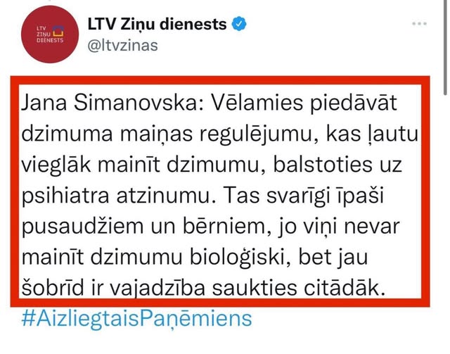 Arī Satversmes 1.pants, kurā Latvija pasludināta par demokrātisku republiku, jau pats par sevi izslēdz valstij iespēju uzspiest visiem iedzīvotājiem vienas ideoloģijas – radikālā feminisma – idejas un postulātus, tādējādi visiem liekot dzīvot tikai saskaņā ar šo ideoloģiju.
