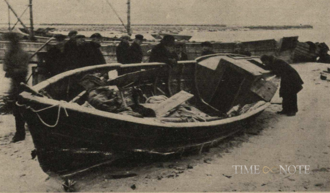 uz ledus, bet tas neizturēja. Arī tuvējās laivas nevarēja sniegt palīdzību, jo ledus dēļ nevarēja piekļūt. Nogrima divas Klapkalnciemā zvejas motorlaivas un noslīka 5 zvejnieki.