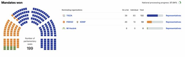 Vēlēšanās ir ar rekordaugstu aktivitāti (77–78%) pirmie daļējie rezultāti un exit-poll rāda, ka Tisza ar Magyar vadībā ir izteiktā vadībā (prognozes: 50–57% balsu, iespējams pat divu trešdaļu vairākums parlamentā – 132–135 vietas no 199).