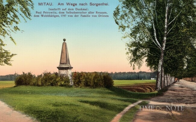 Vietā, kur krustojās ceļi uz abām muižām (mūsd. Kalnciema un Vecais ceļš), Drīzens uzstādīja pieminekli – marmora obelisku ar metāla lodi augšā. Divos medaljonos tika iekalta ķeizara monogramma un uzraksts vācu valodā: Pāvilam Petrovičam, visu krievu patvaldim, labvēlim 1797. gadā no Drīzenu ģimenes