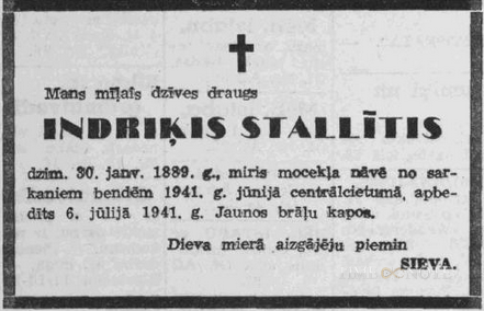 Indriķim Stallītim piespriests un izpildīts nāves sods tāpēc, ka "dzimis kulaku ģimenē. Līdz padomju iekārtas nodibināšanai Latvijā, Siguldā piederējusi liela maizes ceptuve, veikals un divstāvu nams. Ekspluatējis astoņus cilvēkus. Naidīgi noskaņots padomju iekārtai, izplatījis provocējošas baumas, lamājis sarkano armiju, izrādījis simpātijas vāciešiem un izdalījis kontrrevolucionāras lapiņas."