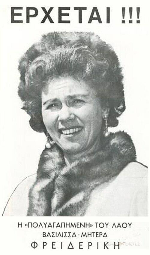 Frederica of Hanover (German: Friederike Luise; Greek: Φρειδερίκη Λουΐζα, romanized: Phreideríkē Louḯza; 18 April 1917 – 6 February 1981) was Queen of Greece from 1 April 1947 until 6 March 1964 as the wife of King Paul and the Queen Mother of Greece from 6 March 1964, when her son Constantine II became King, until 8 December 1974, when the monarchy was officially abolished after a referendum.