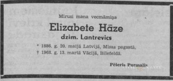 Dzimusi Misas pagastā, mirusi Vācijā. Mazdēls - Pēteris Purmalis.
