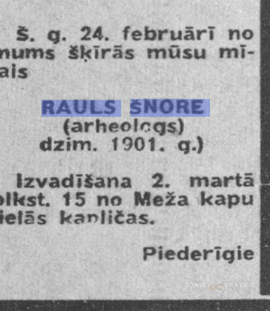 Rauls bija mācījies Oksfordā, Kembridžā un Berlīnē, bet Latvijas brīvvalsts laikā kļuva par Rīgas Pilsētas vēsturiskā muzeja direktoru. Viņa dzīvesbiedre Elvīra nodarbojās ar zinātnisko darbu. Kad sākās karš un Latviju okupēja, gandrīz visus profesionālos arheologus represēja, tāpēc Rauls 1944. gadā organizēja ģimenei pārcelšanos ar laivu uz Zviedriju. Bet neveiksmīgi – viņu noķēra, tiesāja par “dzimtenes nodevību” un izsūtīja uz Sibīriju. Šnore mira 1962. gadā pēc atgriešanās.