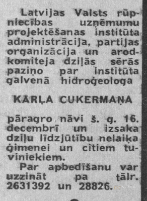 Rīgas Meža kapos apglabāts blakus Lilijai Cukermanei un Kārlim Cukermanim (1971-2008).